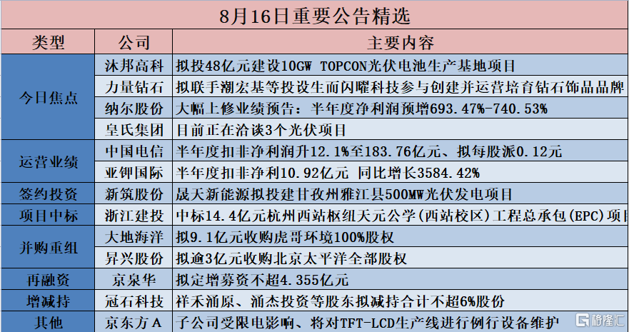 格隆匯公吿精選︱多家公司迴應臨時停產影響;力量鑽石擬聯手潮宏基打造培育鑽石飾品品牌;沐邦高科擬48億元投建10GW TOPCON光伏電池生產基地項目