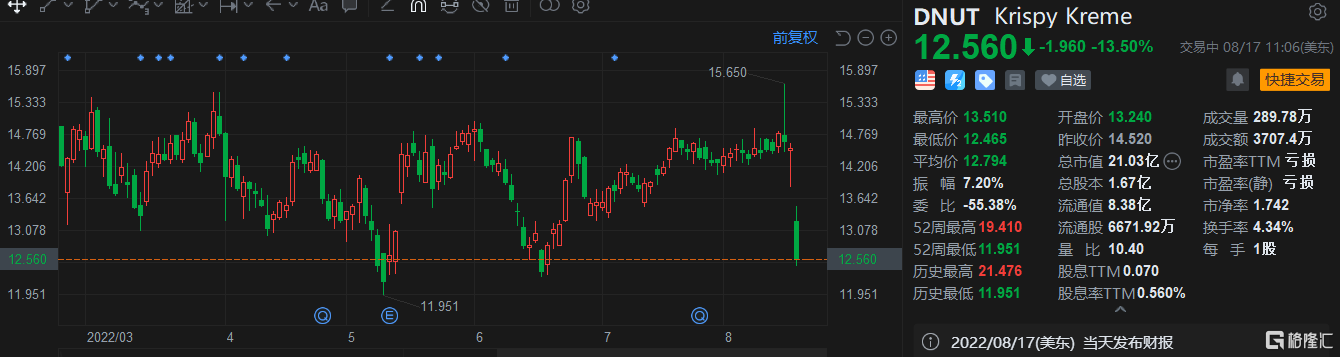格隆匯8月17日丨Krispy Kreme(DNUT.US)跌超13%,報12.56美元。該公司二季度營收3.75億美元,較預期低1069萬美元;調整後每股盈餘8美分,低於市場預期的10美分。公司預計2022財年營收14.9-15.2億美元,市場預期15.6億美元;預計調整後每股盈餘29-32美分,市場預期41美分。