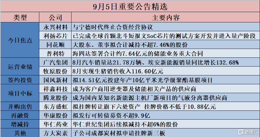 格隆匯公吿精選︱永興材料與寧德時代終止合資經營協議;全新好獲共青城匯富欣然投資舉牌;祥鑫科技中標7-8億元逆變器及儲能相關產品項目