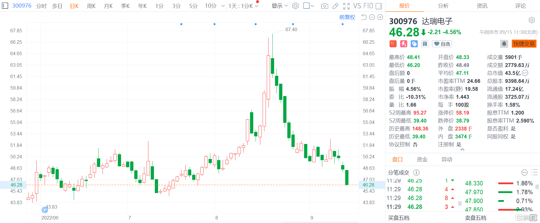 A股異動 | 達瑞電子(300976.SZ)創一個半月新低 持股7.48%股東付學林擬減持不超1%股份