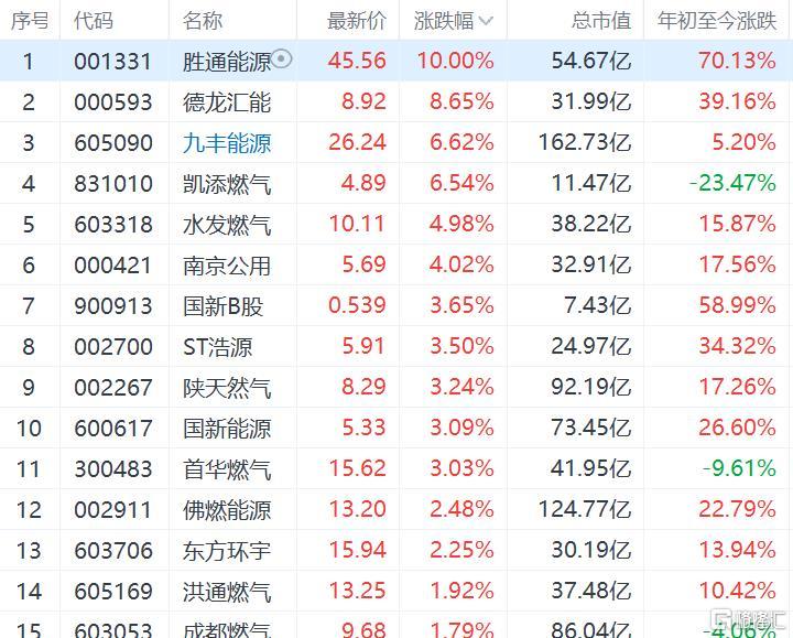 格隆匯9月21日丨燃氣股大漲,勝通能源漲停,德龍匯能漲8%,九豐能源、凱添燃氣漲6%,水發燃氣漲近5%。歐洲基準天然氣期貨價格在連續三天下跌後出現反彈,收漲6.6%,交易員們正在權衡歐洲大陸為緩解冬季供應危機而加大的努力是否足以避免供應短缺。另外,當地時間9月20日,俄羅斯天然氣工業股份公司發佈消息説,“西伯利亞力量”天然氣管道的天然氣運輸將於9月22日至29日期間暫停,原因是將進行管道維修工作。德意志銀行分析師表示,鑑於今年冬天俄羅斯可能不會提供天然氣,歐洲可能會以某種形式實行定量配給,除非氣温温和。亞洲對液化天然氣的需求增加,也將可能推高天然氣價格。
