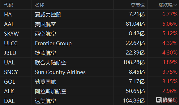 格隆匯9月27日丨美股航空股走高,夏威夷控股漲超6%,美國航空、西空航空漲超5%,Frontier集團、捷藍航空漲超4%,聯合大陸航空、達美航空跟漲。美國銀行稱,截至9月18日的一週,系統淨銷售額僅比2019年的水平低2.9%,而前一週為低6.0%。與2019年相比,上週的定價上漲了5.2%,而系統客容量下降了7.7%。企業渠道銷售本週再度改善,因定價改善,抵消了銷量小幅回落的影響。在網站訪問量方面,聯合大陸航空表現強勁,而夏威夷控股和阿拉斯加航空似乎已經顯示出一些早期跡象,表明消費者可能正在減少高端度假計劃。