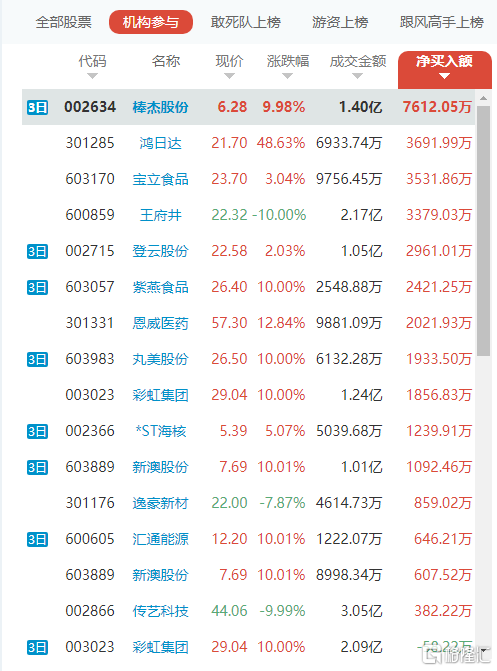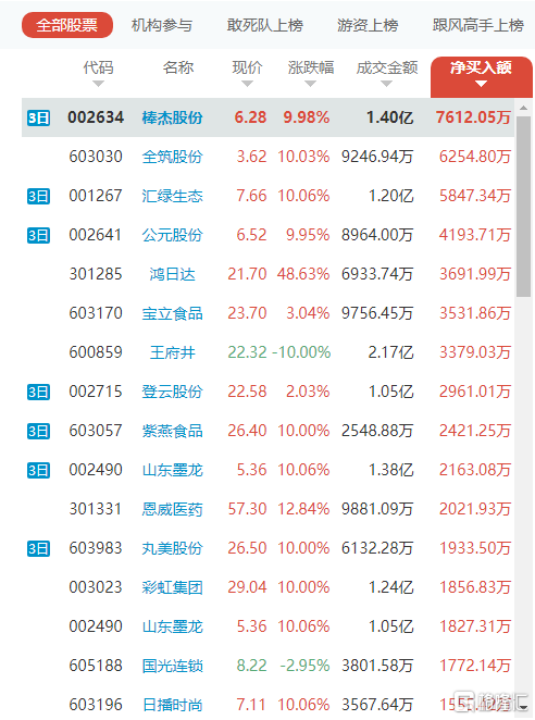 今日龍虎榜淨買入額榜前三為全築股份、鴻日達、寶立食品,分別為6254.80萬元、3691.99萬元、3531.86萬元。