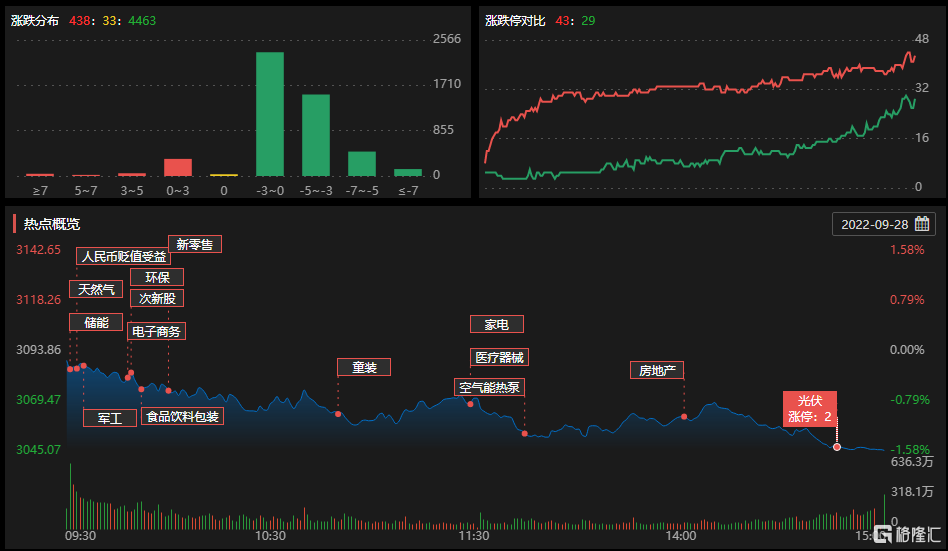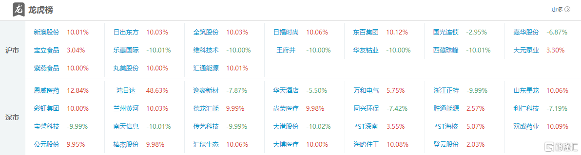 個股方面,疊加了光伏、儲能、天然氣概念的公元股份4板,熱泵概念股海鷗住工3板、日出東方3板,醫藥醫療方面雙成藥業3板、尚榮醫療2板、大博醫療2板,啤酒股蘭州黃河3板,股權轉讓的匯通能源3板,外貿出口方面新澳股份2板、棒傑股份2板,油氣股山東墨龍2板。今日收漲個股418只,收跌個股4372只。