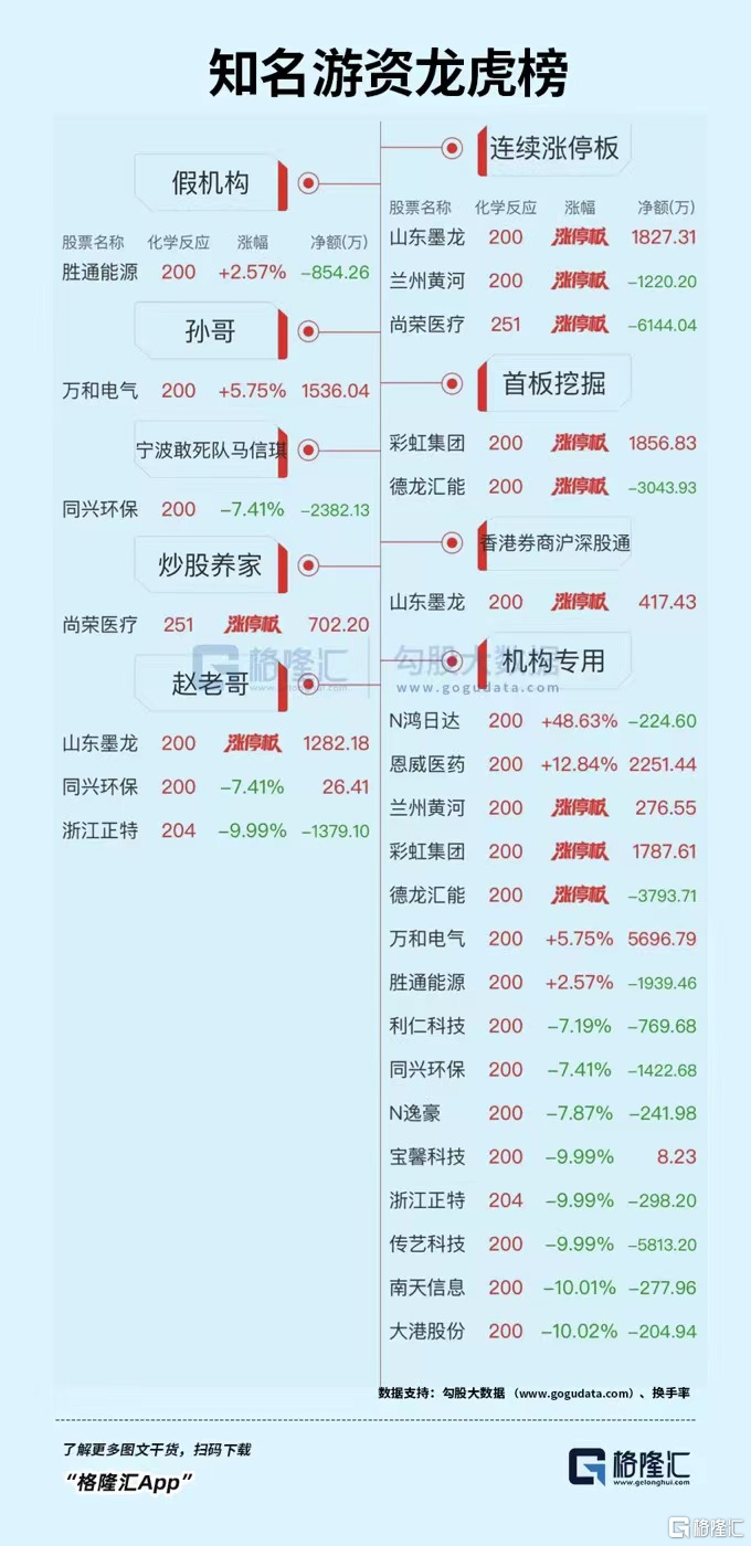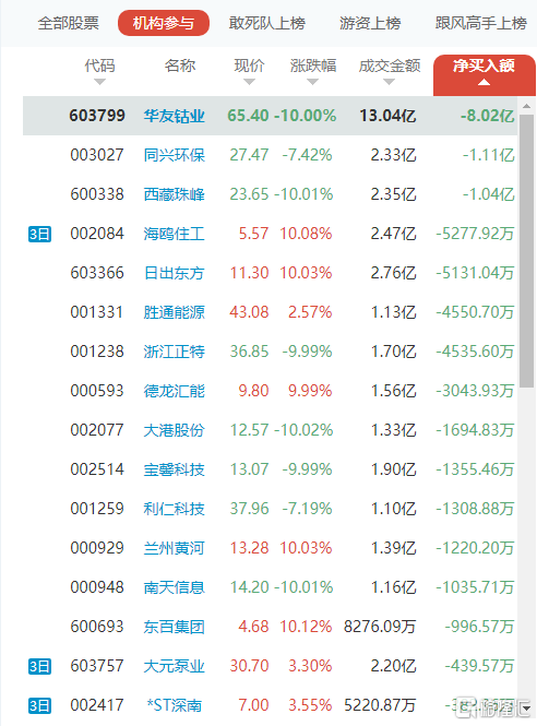 龍虎榜中涉及機構專用席位的個股中,當日淨賣出額前三為華友鈷業、日出東方、傳藝科技,分別為4.74億元、1.07億元、5813.20萬元。