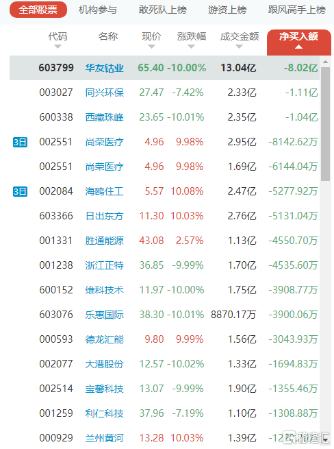龍虎榜淨賣出額前三為華友鈷業、同興環保、西藏珠峯,分別為8.02億元、1.11億元、1.04億元。