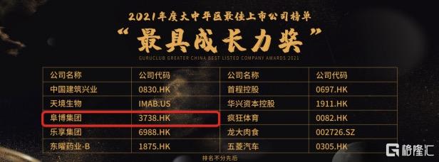 12月10日,由格隆匯主辦的“大中華區最佳上市公司·2021”盛典上,阜博集團(SEHK:3738)榮獲年度“最具成長力獎”。