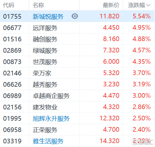 港股異動 | 物管股走強 新城悦服務(1755.HK)漲超5%