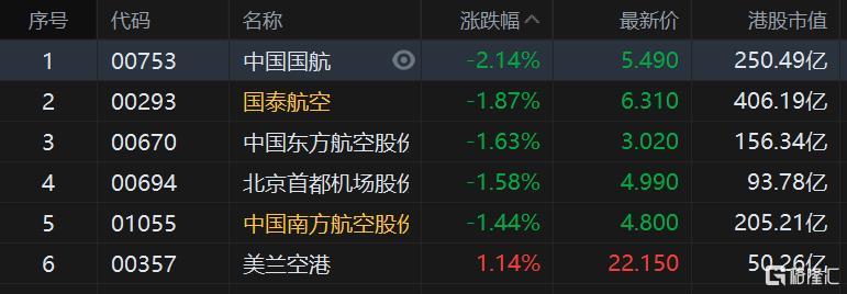 港股異動 | 航空股集體下跌 國泰航空跌近2%