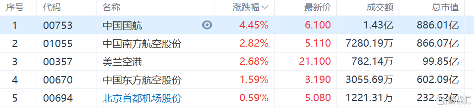 格隆匯1月20日丨航空股拉昇,中國國航漲4.45%,南方航空漲約3%。