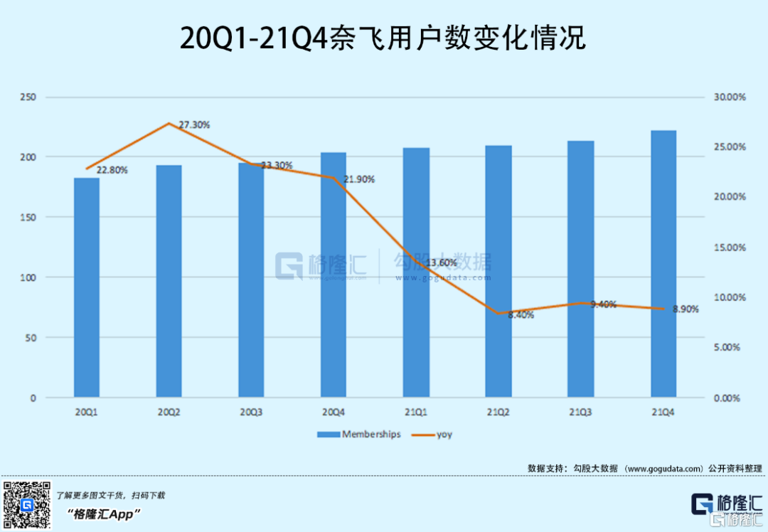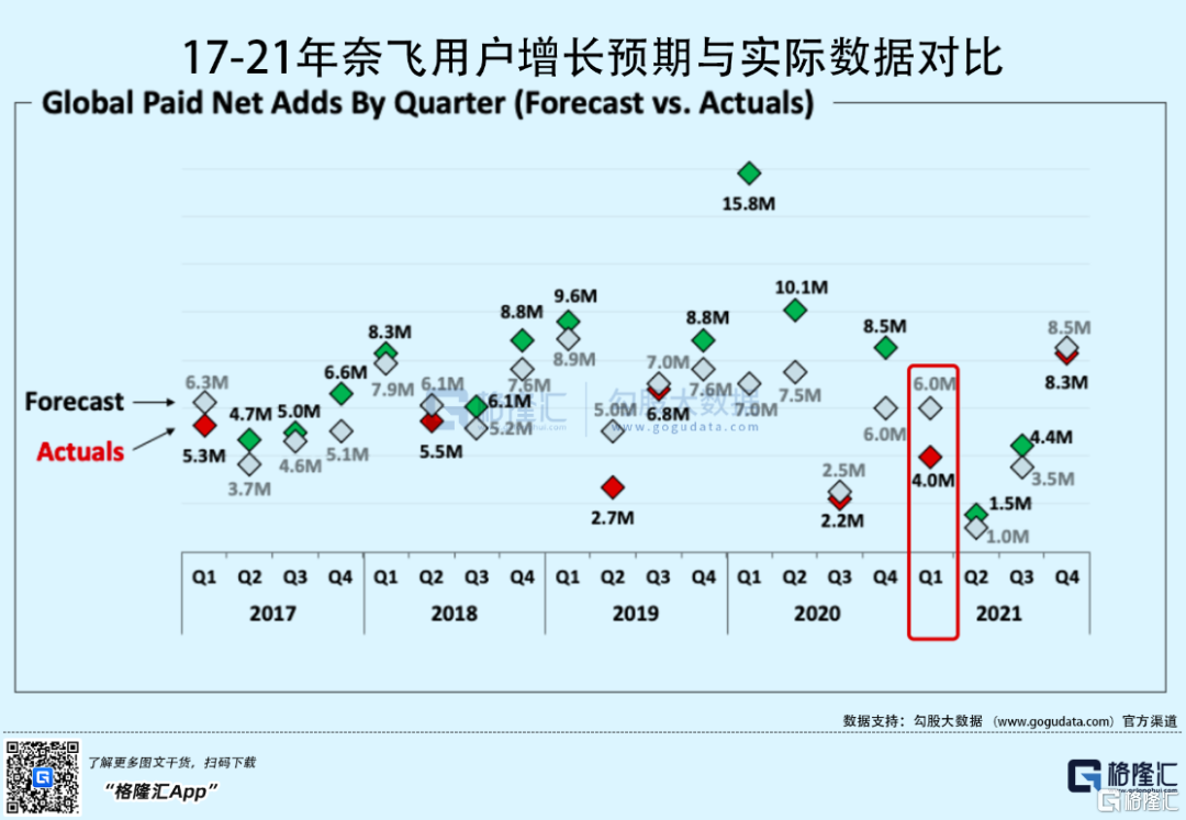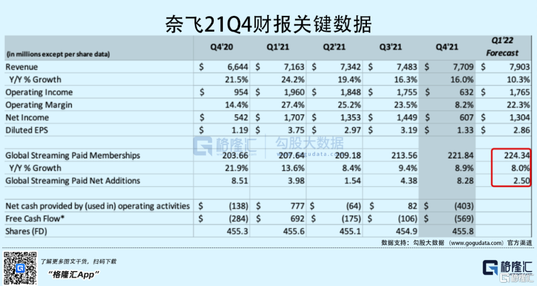 21Q4奈飛營收77億美元,同比增長16%,和預期in line;EPS1.33美元,大幅高於預期的0.8美元。從這個層面來説,奈飛的業績還是不錯的。問題主要還是出在了指引上,具體是付費用户增長的指引——22Q1預期全球付費用户增長250萬,達到2.24億,而市場的預期是650萬。