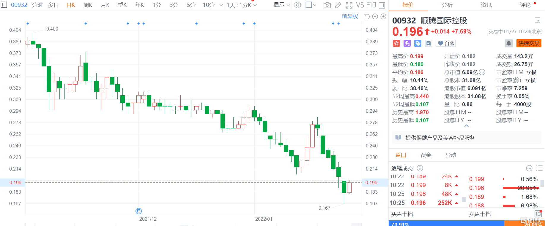 格隆匯1月27日丨順騰國際控股漲7.69%,報0.196港元,總市值6億港元。