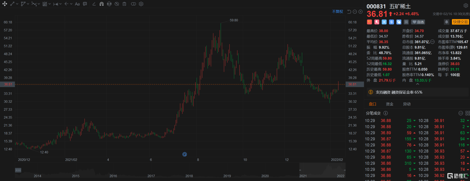 格隆匯2月16日丨五礦稀土(000831.SZ)漲6.48%,報36.81元,總市值361億元。該公司昨日在投資者互動平台表示, 聖工寨稀土礦開發利用方案已通過自然資源部組織的評審,並已完成網上的公司。此外,據中國稀土行業協會,2月14日稀土價格指數為420.6,較上週五漲17.1點,續創歷史新高。東北證券研報指,從主題投資到產業變革,應重視稀土板塊估值體系重構的歷史性機遇。1)長期看,產業變革下稀土板塊估值體系或迎重構。當前稀土可類比2015-2016年的鋰和2018年的鈷,新能源上游材料屬性正逐步強化,未來有望復刻歷史上鋰鈷需求高增的邏輯,同時,政策嚴控+行業高集中的特性使得稀土的供給端甚至要比鋰鈷還要更優異,未來穿越週期的能力或更強,稀土板塊的估值體系正迎重構。2)中期看,未來三年供不應求,行業景氣度有望持續提升。下游電動車賽道長坡厚雪,同時風電、空調等領域亦多點開花,將充分打開稀土需求空間,而國內外供給彈性均較弱,預計未來三年稀土鐠釹供需緊張態勢延續,行業景氣度有望不斷提升。