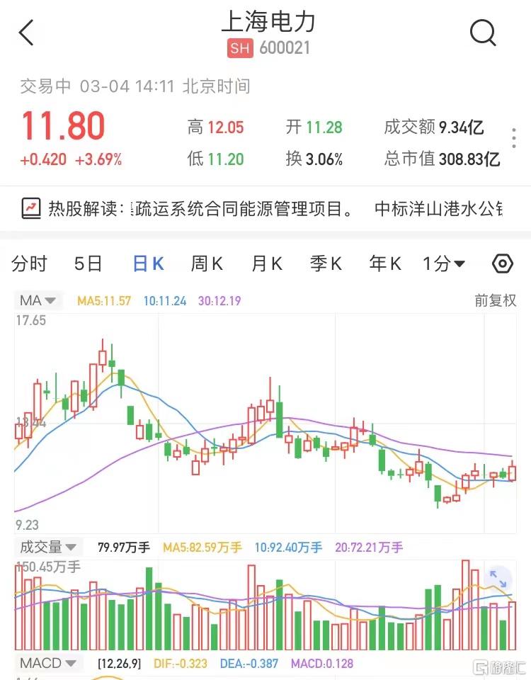 A股異動 | 上海電力(600021.SH)一度漲近6% 中標洋山港水公鐵集疏運系統合同能源管理項目