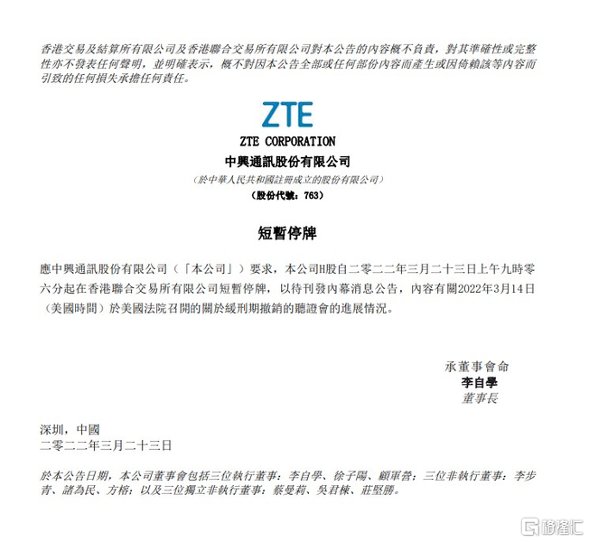 今早,中興通訊A、H股同時公吿稱,A、H股短暫停牌,以待刊發內幕消息公吿,內容有關2022年3月14日(美國時間)於美國法院召開的關於緩刑期撤銷的聽證會的進展情況。