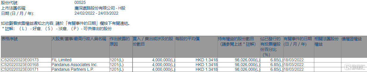 格隆匯APP獲悉,根據聯交所最新權益披露資料顯示,2022年3月18日,廣深鐵路股份(00525.HK)遭FIL Limited在場內以每股均價1.3418港元減持400萬股,涉資約536.72萬港元。